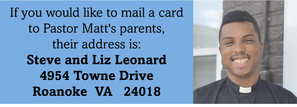My family and I thank everyone for the prayers, support and comfort you all have given us as we continue to navigate throughthis journey. I will keep the congregation informed when updates come. – In Christ, Pastor Matt