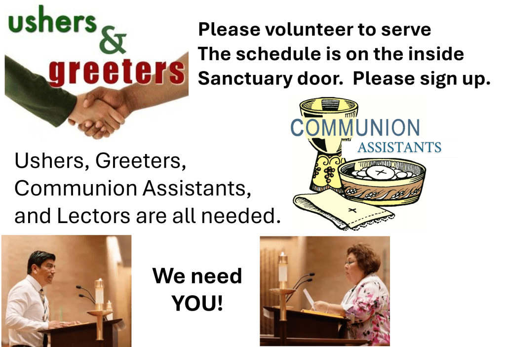 Ushers, Greeters, Communion Assistants Needed We currently have NO ONE signed up to serve as greeters, ushers, lectors or communion assistants Share this: Click to share on X (Opens in new window) X Click to share on Facebook (Opens in new window) Facebook Like Loading... Related