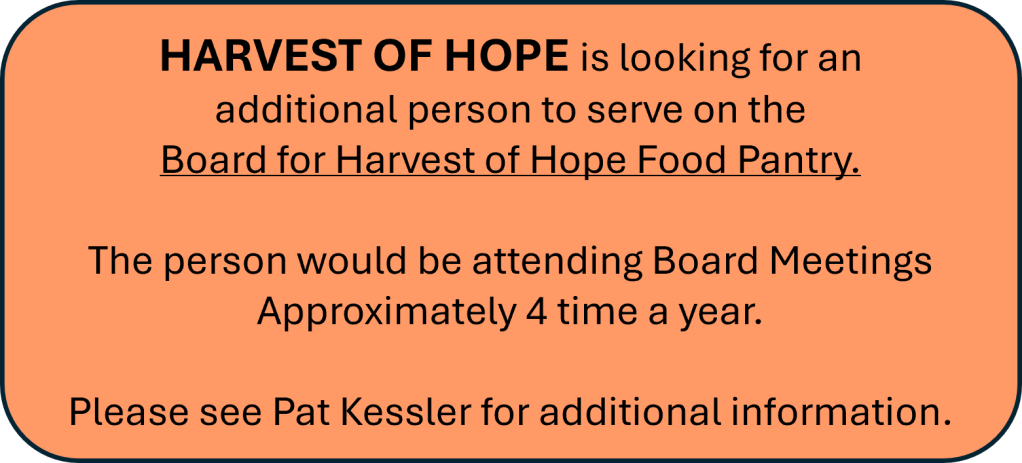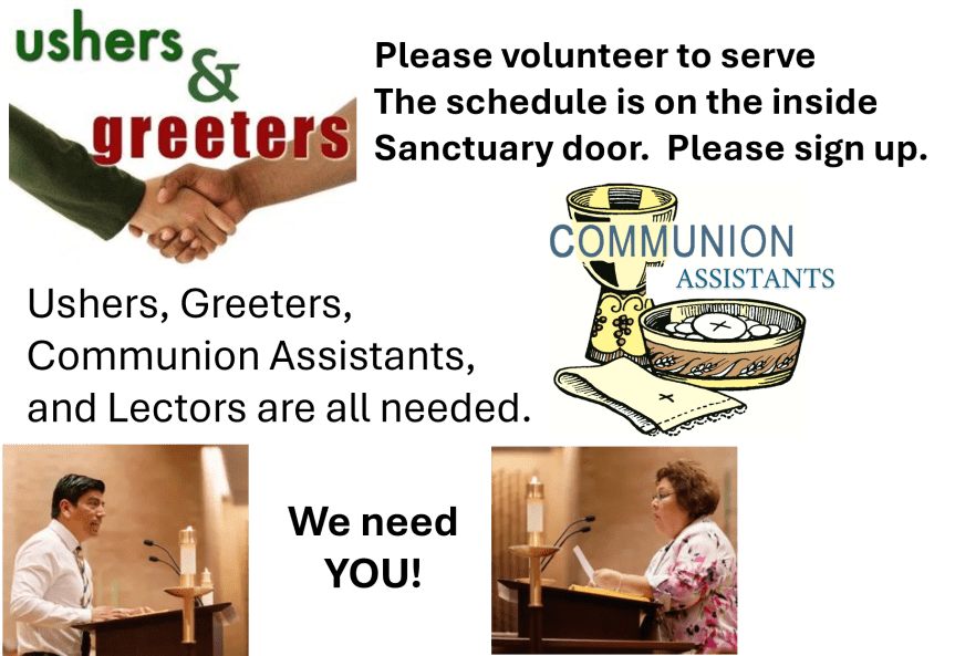 We currently have no one volunteering to serve as Greeters, Ushers, Lectors or Communion Assistants. Please see the schedule on the sanctuary door and see where you are able to help!