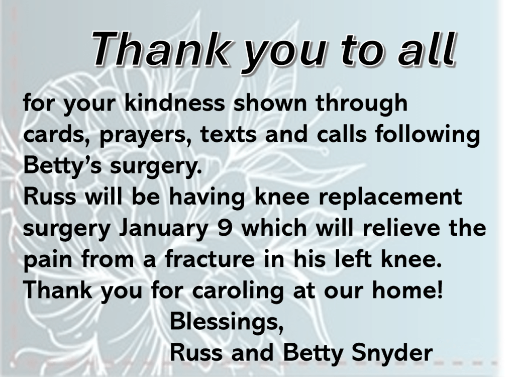 Joann Cuthbert, Shirley Thoman, Bonnie Laughman,Monica Lee, David Snyder, Emily Snyder, Kirby Hengst, Linda Calderone, Pat Warner, Randy Wentz, Justin Kuhn, Irelyn Sprenkle, Mervin Myers, Patti Minton, , Barbara Senft, Nicole Hunnings, Family of JoAnn Harrold, Mae Wagner, Amy LeVault, Larry Linebaugh, Russ and Betty Snyder, Jacob Hoover