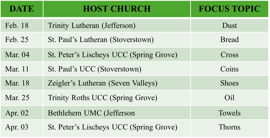 Host churches will offer a simple soup supper at 6 pm (except Good Friday), and worship at 7 pm