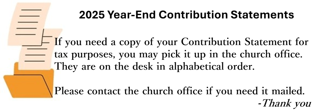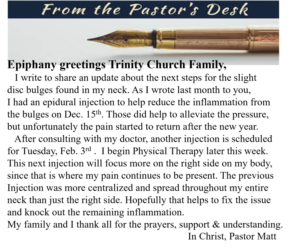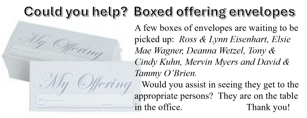 Email (trinitylcjefferson@gmail.com) or call the church office (717-229-2619) with updates to those listed above who can be removed from the list or those who need to be added. Call the church office Tuesday or Wednesday between 8 a.m.-1 p.m.