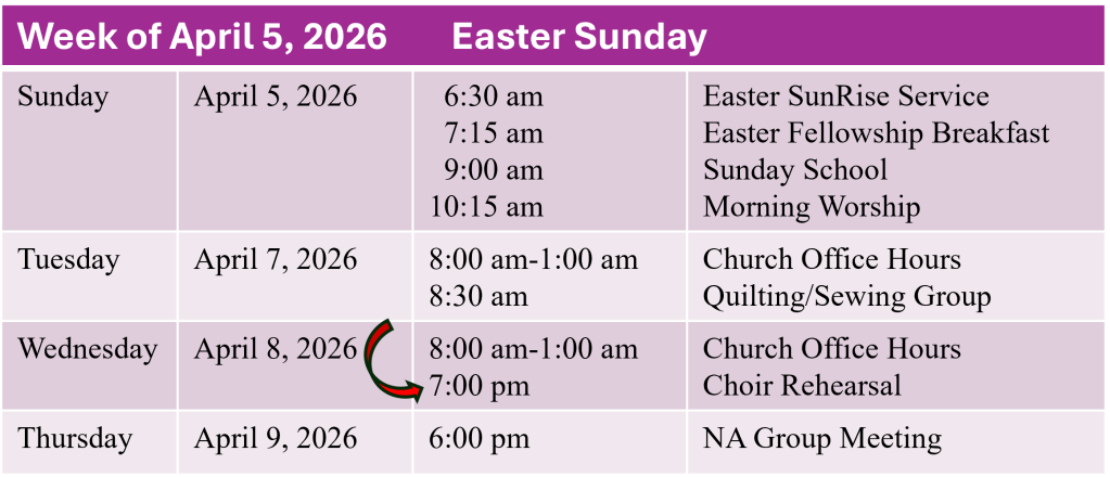 Calendar Week of April 5, 2026 Beginning April 8, 2026 choirs will return to rehearsals on Wednesdays at 7:00 p.m. Share this: Share on X (Opens in new window) X Share on Facebook (Opens in new window) Facebook Like Loading...